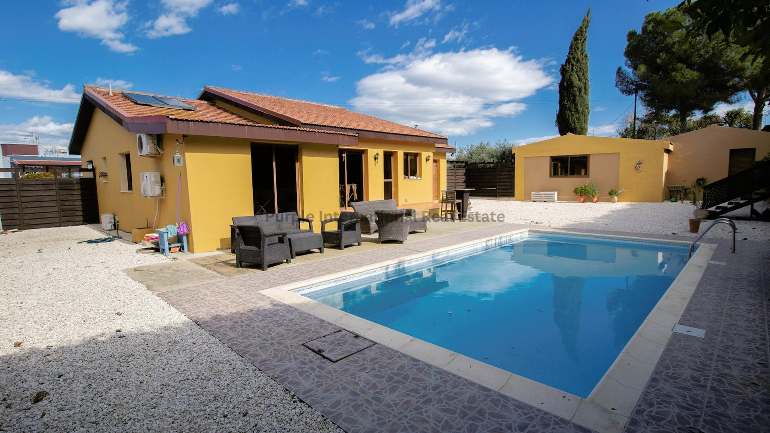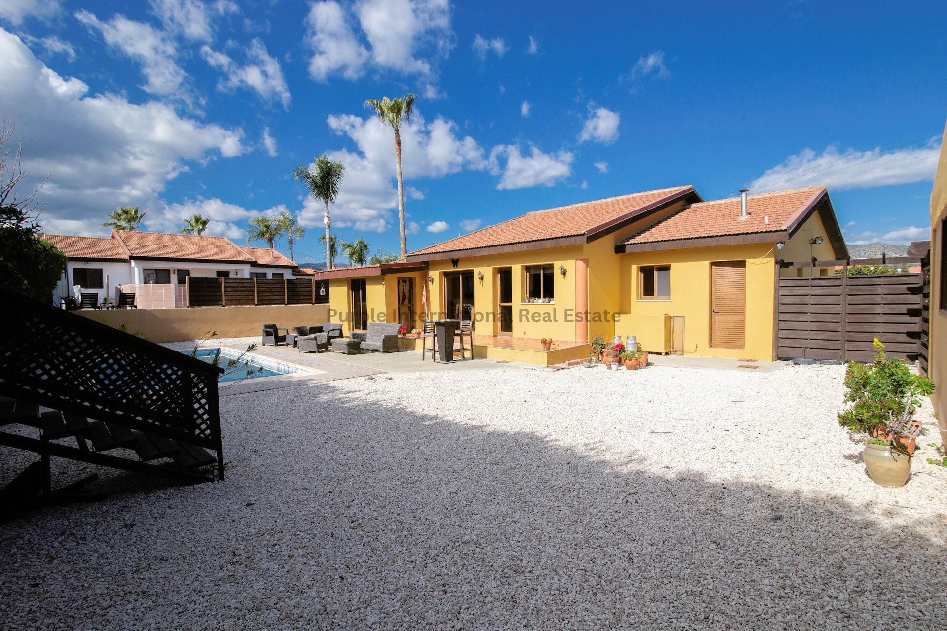 The property sits back from the road on a fantastic sized plot of 1364sqm raised on different levels, covered with white stone, the area is very low maintenance.