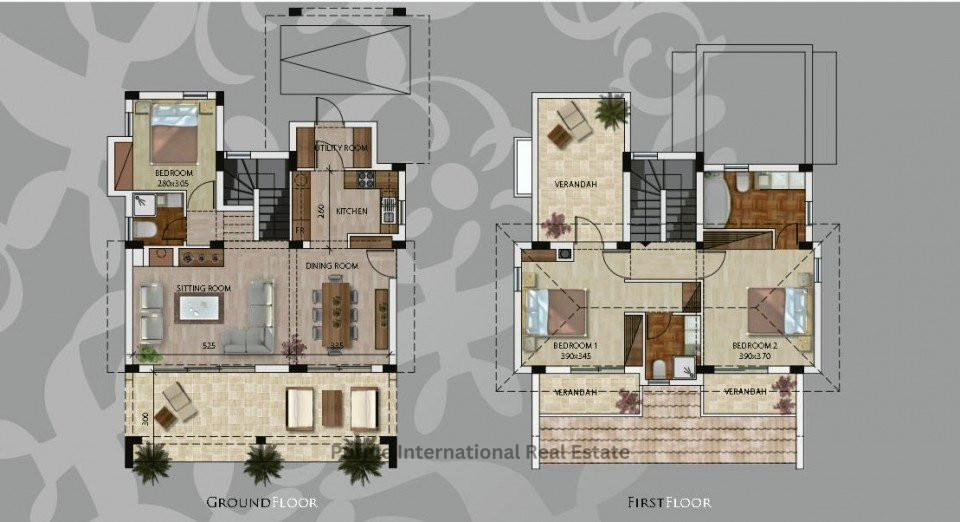 Type A, villa 2,3,8: Plots 655-755 sq.m, Total covered area 161.5 -181.5 sqm, Open veranda 24 sq.m