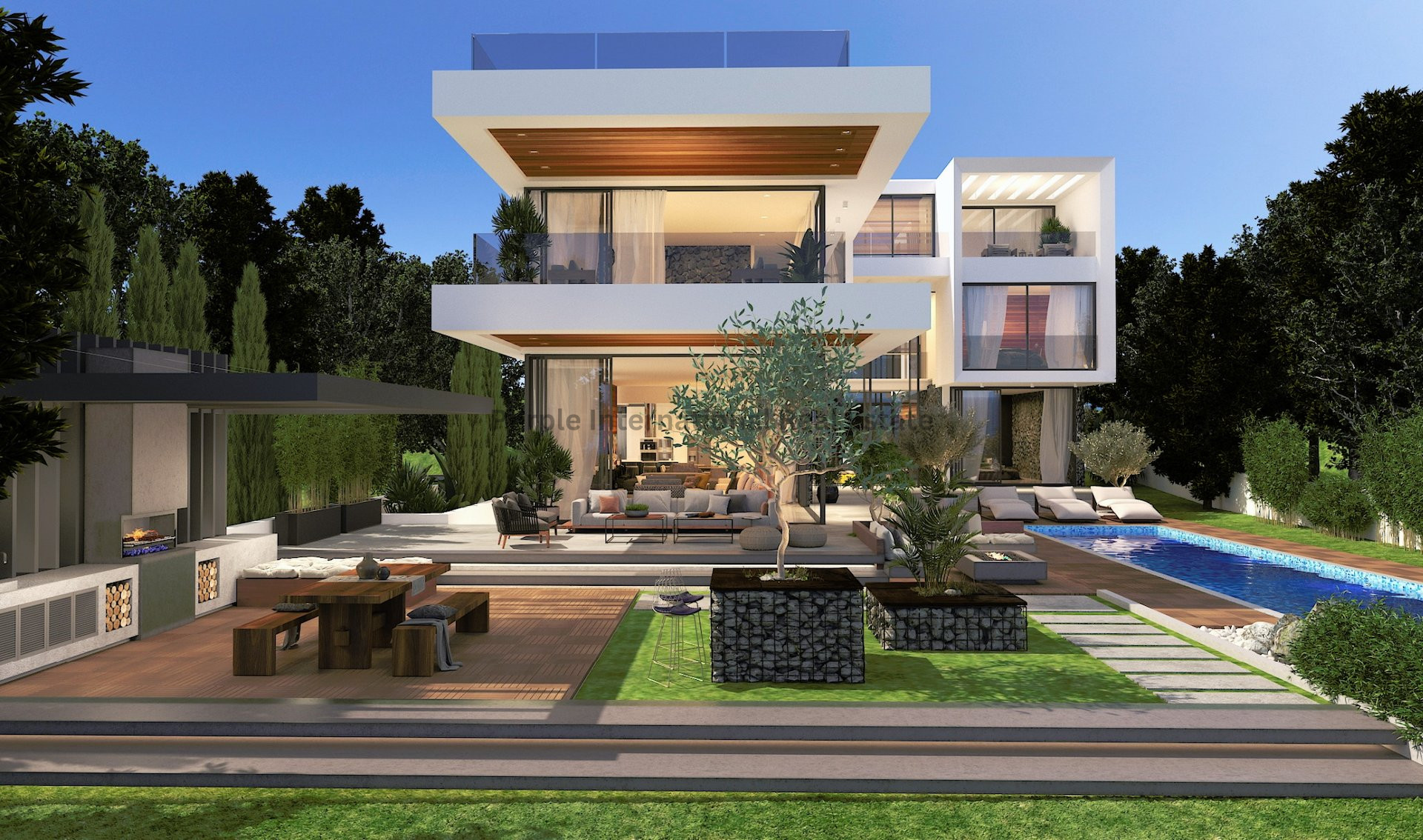 • Private infinity swimming pool with the surrounding patio paved in anti-slip granite tiles natural stone or combination with synthetic wooden deck