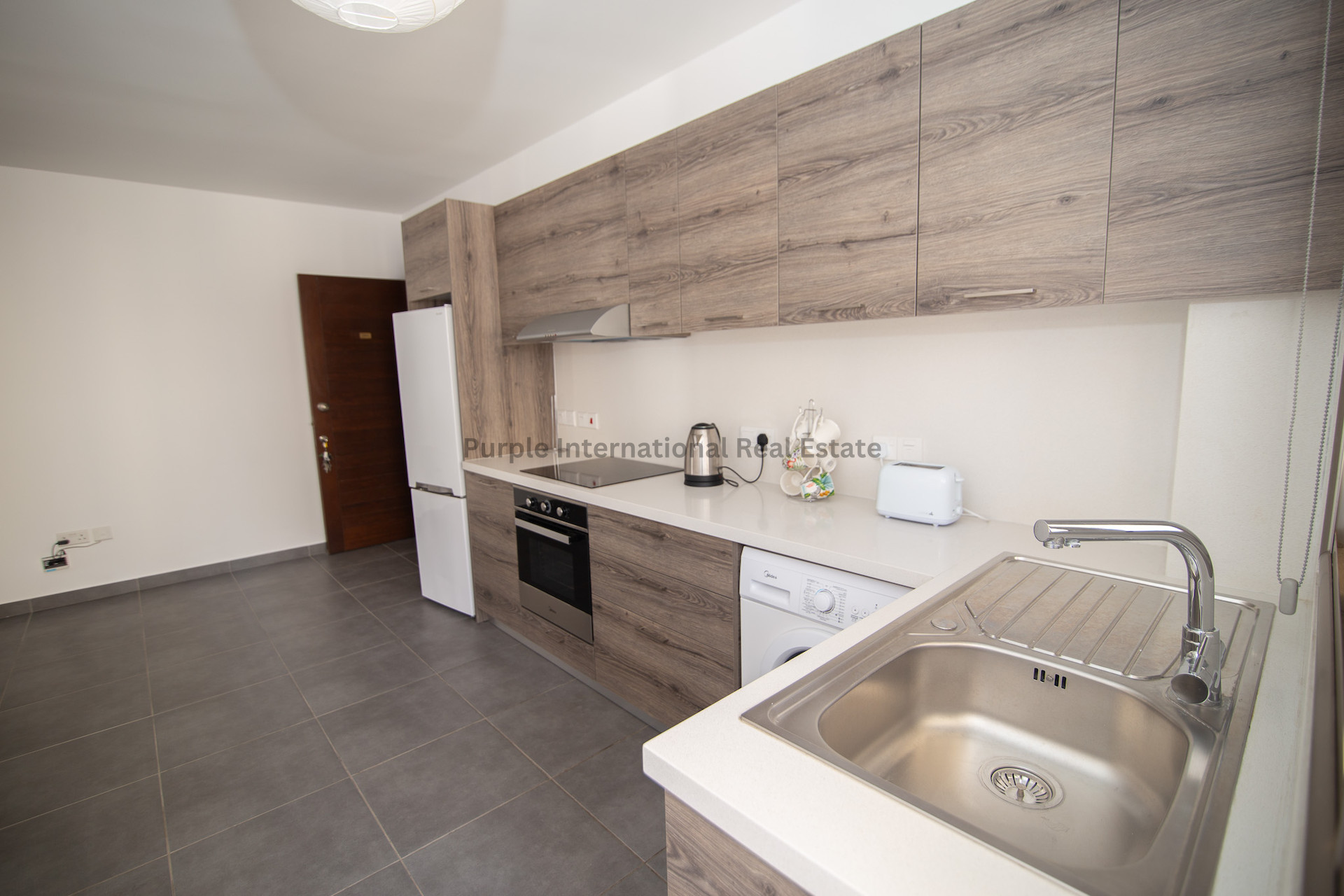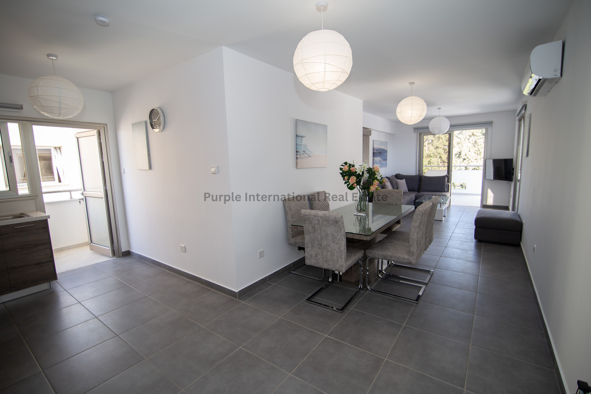 Inside, the apartment boasts an open-plan layout featuring a spacious lounge that flows seamlessly into the dining area and a fully fitted kitchen complete with ample cupboard space and worktops.