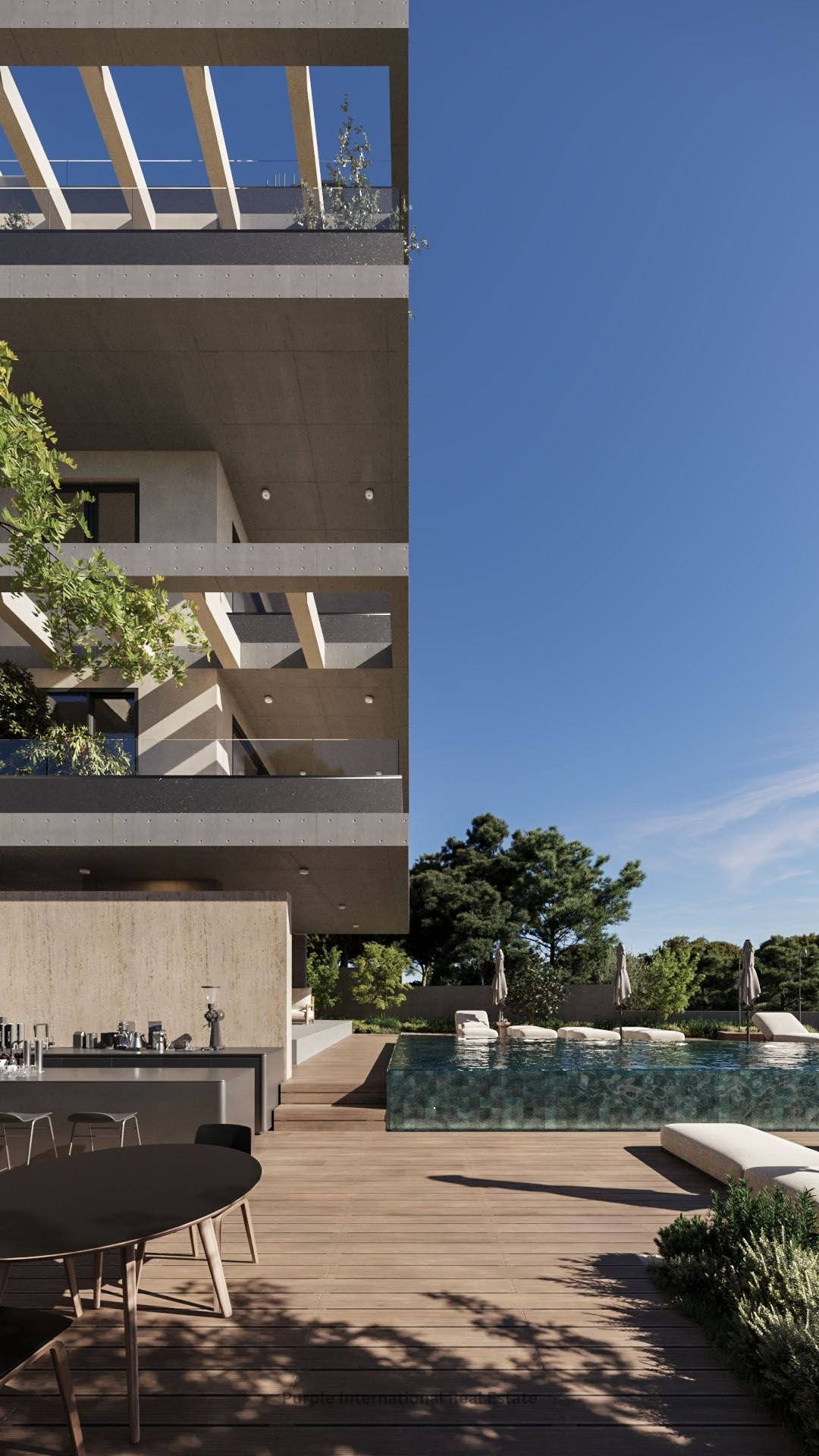 The heart of the building is its shared outdoor space. At its center is the signature pool a sparkling blue contrast to the soft greens of surrounding trees. Adjacent to the pool, the lounge and BBQ area offers a setting for connection. It’s a place where residents unwind, entertain, and enjoy long Mediterranean evenings. This is not a crowded resort. It’s an intimate gathering place, with design and layout encouraging conversation, rest, and community.