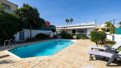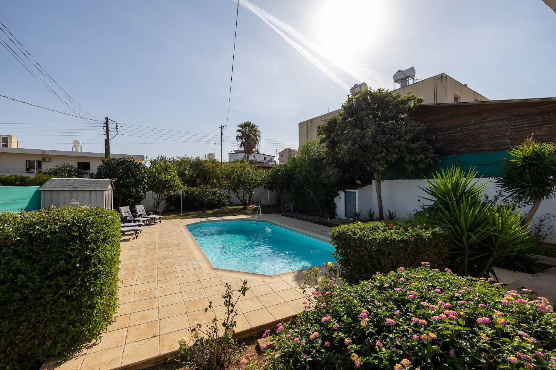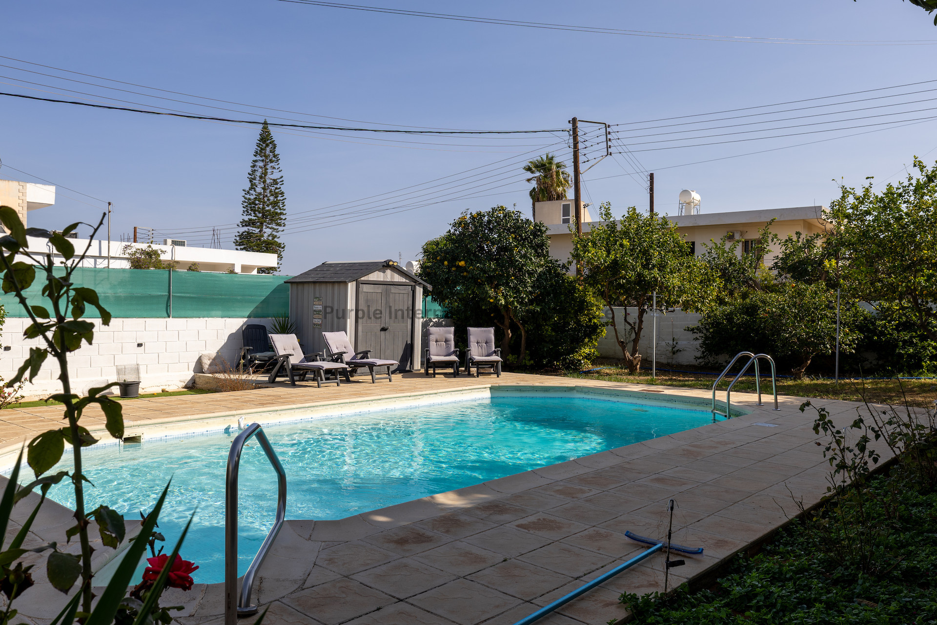 Set on a large 803sqm plot, the property boasts an impressive outdoor area with mature trees and landscaped gardens, ideal for entertaining, relaxing, or enjoying the Mediterranean sunshine. The private swimming pool provides the perfect retreat for hot summer days, while the garage offers covered parking for one car and a separate storage room for added practicality.