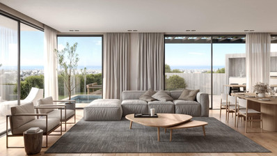 The villa is designed with open-plan living and dining areas, providing a sense of light and freedom throughout the home. Large windows invite natural light while offering panoramic sea views that you can enjoy every day. Step outside to your private swimming pool, perfect for relaxing or entertaining guests.