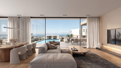 The villa is designed with open-plan living and dining areas, providing a sense of light and freedom throughout the home. Large windows invite natural light while offering panoramic sea views that you can enjoy every day. Step outside to your private swimming pool, perfect for relaxing or entertaining guests.