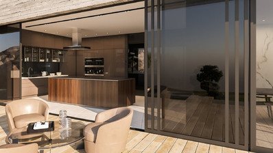 На первом этаже вас встречает современное минималистичное открытое пространство, которое включает в себя гостиную, столовую и кухню. Все помещения выходят на веранду через стеклянные двери, обеспечивая большую открытость. Весь первый этаж выдержан в земляных тонах, сочетающих в себе различные текстуры и украшен полами и стенами из итальянского мрамора. На второй этаж можно подняться по лестнице или на лифте. На втором этаже расположены четыре спальни с ванными комнатами. Все комнаты светлые, просторные и наполнены солнцем, поскольку имеют большие стеклянные двери от пола до потолка, из которых открывается захватывающий вид. При необходимости роскошные длинные шторы и затемняющие экраны могут превратить эти комнаты в полную темноту.