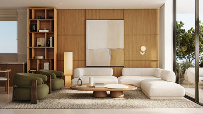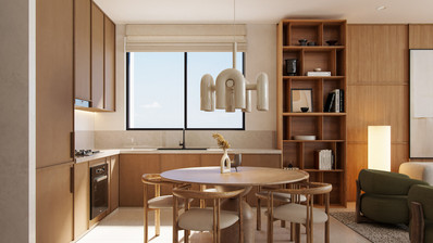 Современный фасад гармонично объединяет различные материалы и текстуры, а апартаменты с отделкой в натуральных тонах и минималистичном стиле отличаются высококачественными материалами и большими окнами, которые наполняют помещения естественным светом, создавая спокойную и уютную атмосферу.