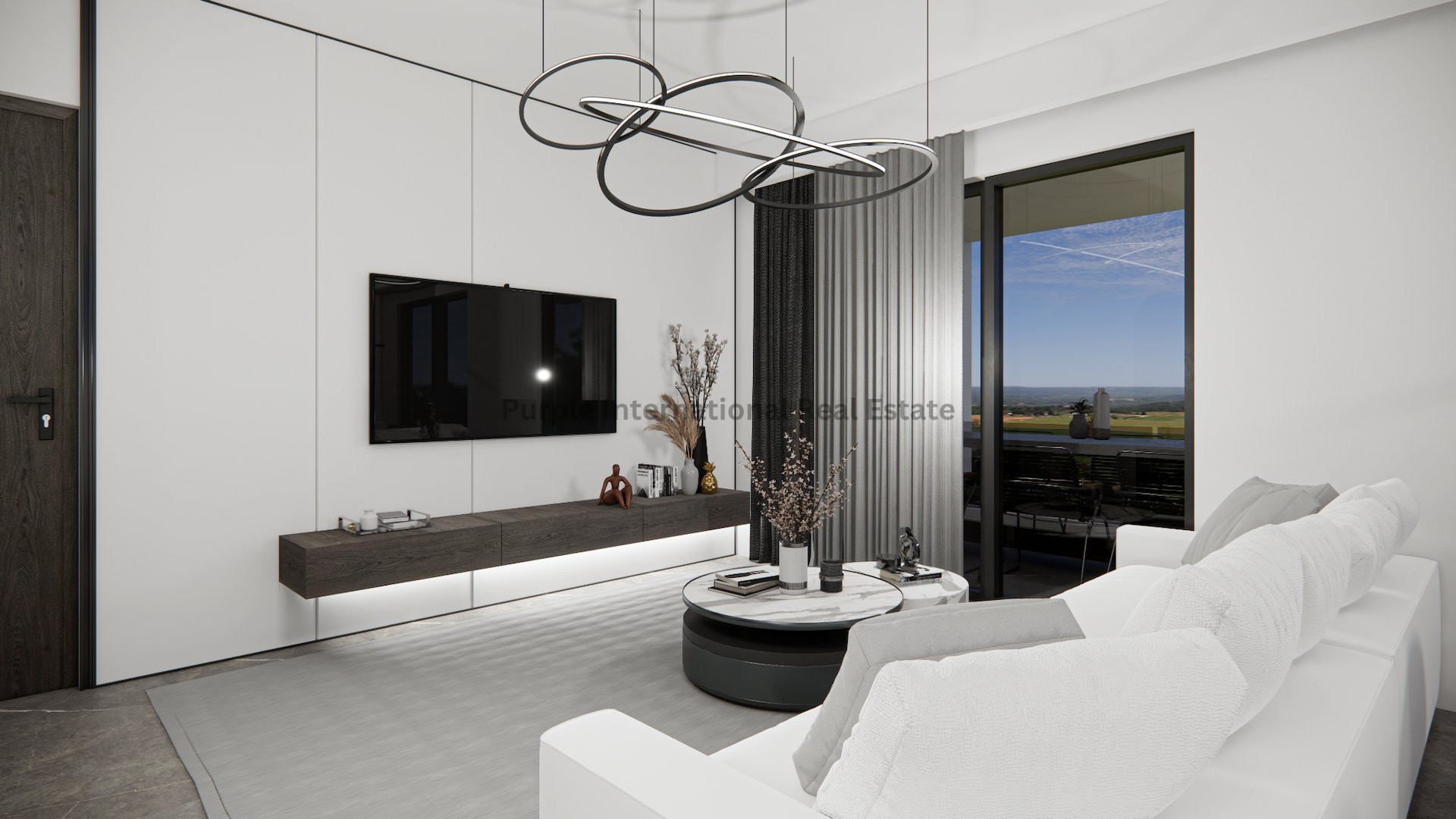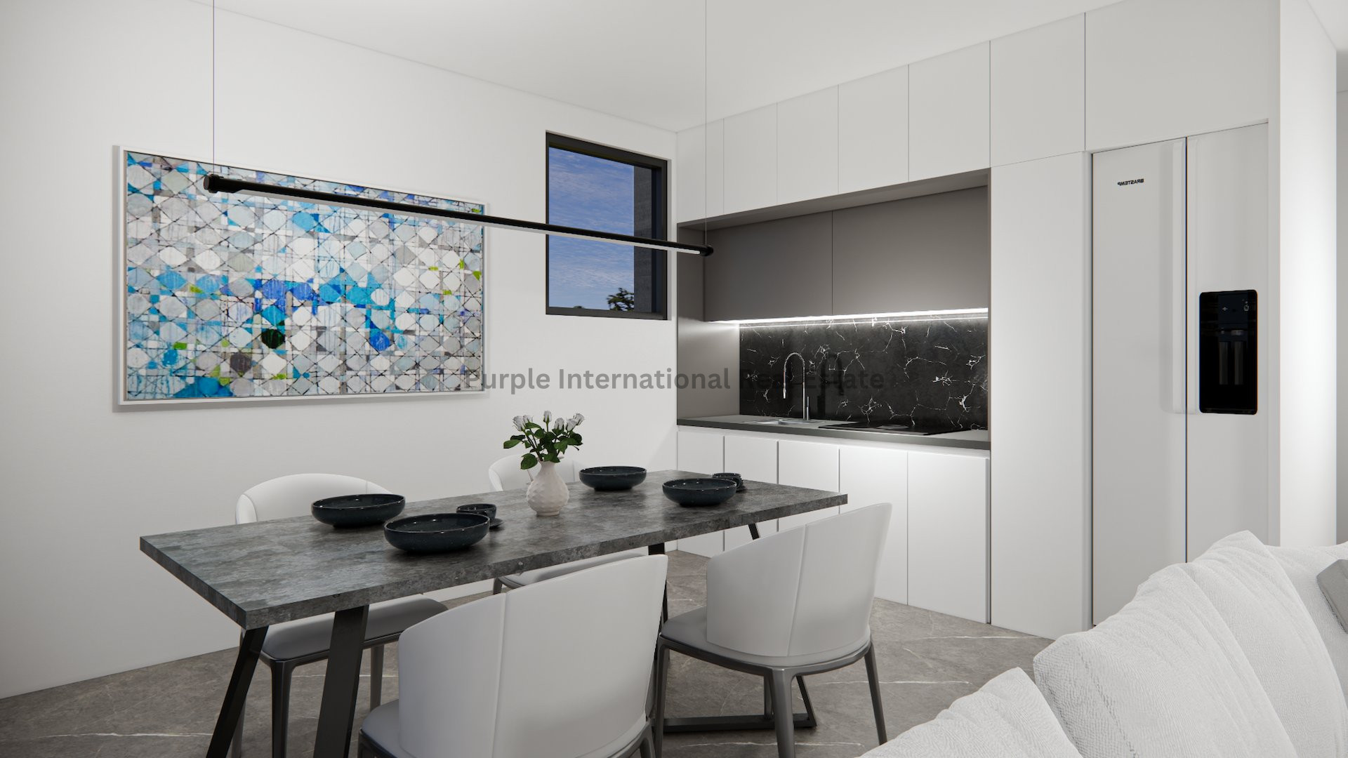 The open-plan layout includes underfloor heating for year-round comfort, and large windows offer stunning views of the sea. Residents enjoy access to a communal swimming pool, perfect for relaxing on warm days.