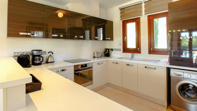 As you step through the impressive entrance, you'll find yourself in the spacious open plan living and dining area. French doors gracefully open onto the pool terrace, seamlessly merging the indoor and outdoor spaces. The lounge area is exquisitely furnished with a plush sofa, comfortable armchair, and a large flat-screen TV. The tastefully chosen accessories, including a designer coffee table and captivating wall art, add a touch of uniqueness to the space. Adjacent to the lounge is a modern dining area with an elegant dining table and chairs, perfectly complemented by a practical sideboard. Separated by this sideboard, the kitchen features sleek high-gloss units and is equipped with top-of-the-line appliances such as an electric oven and hob, integrated dishwasher, washing machine, and microwave. Additionally, a conveniently located cloakroom is situated on the ground floor.