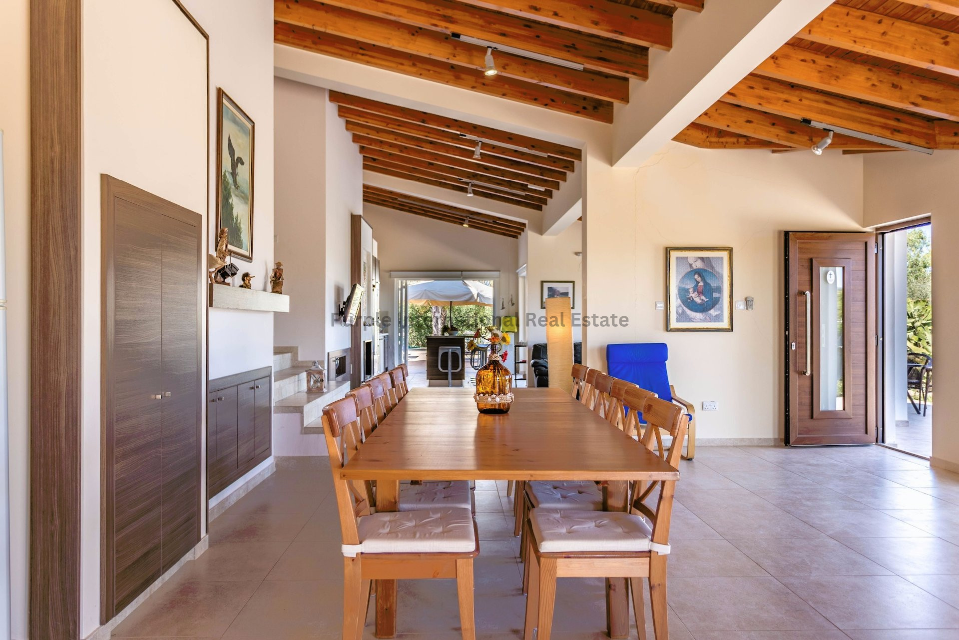 Outdoors, the beautifully landscaped garden surrounds an expansive pool area and inviting lounge space—perfect for enjoying Cyprus' sunny climate in a peaceful and secluded setting. A dedicated al fresco dining area completes the experience, offering a true oasis for relaxation and social gatherings.