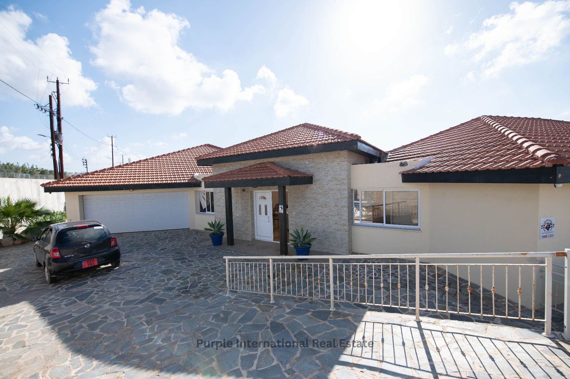 Parking for multiple vehicles, with a garage for two cars and additional uncovered parking.