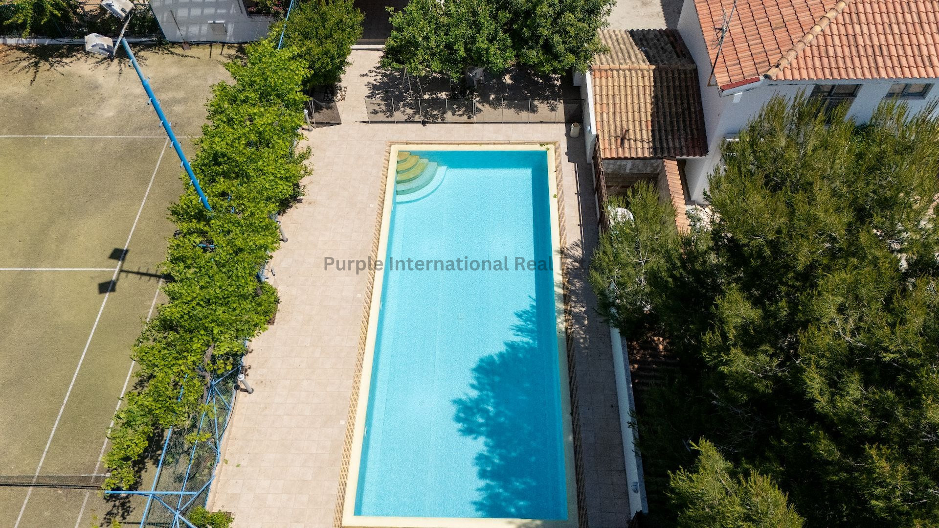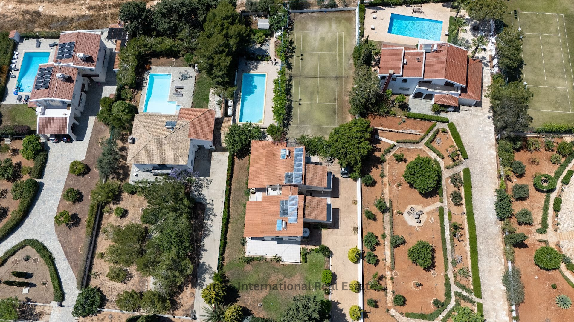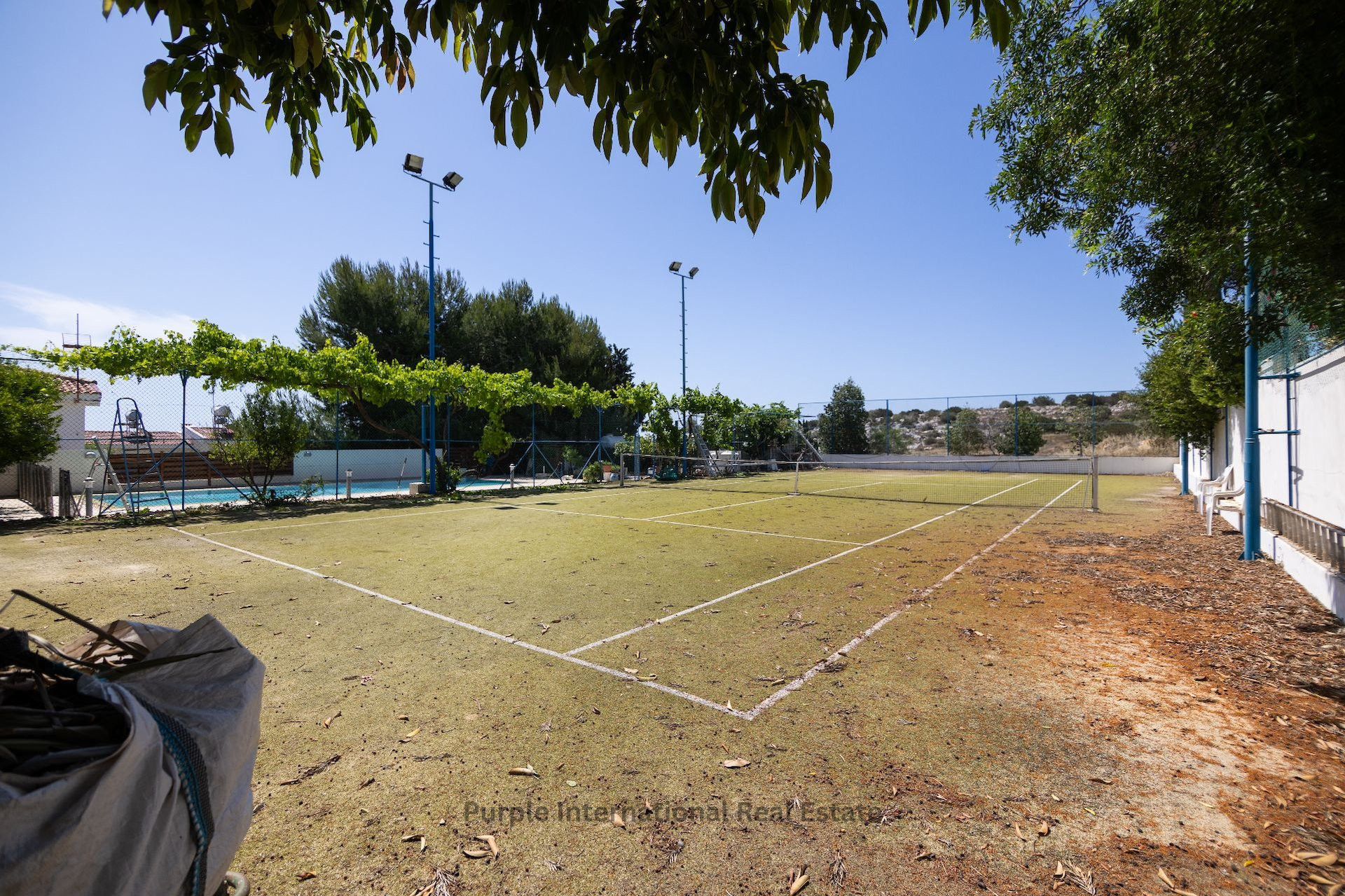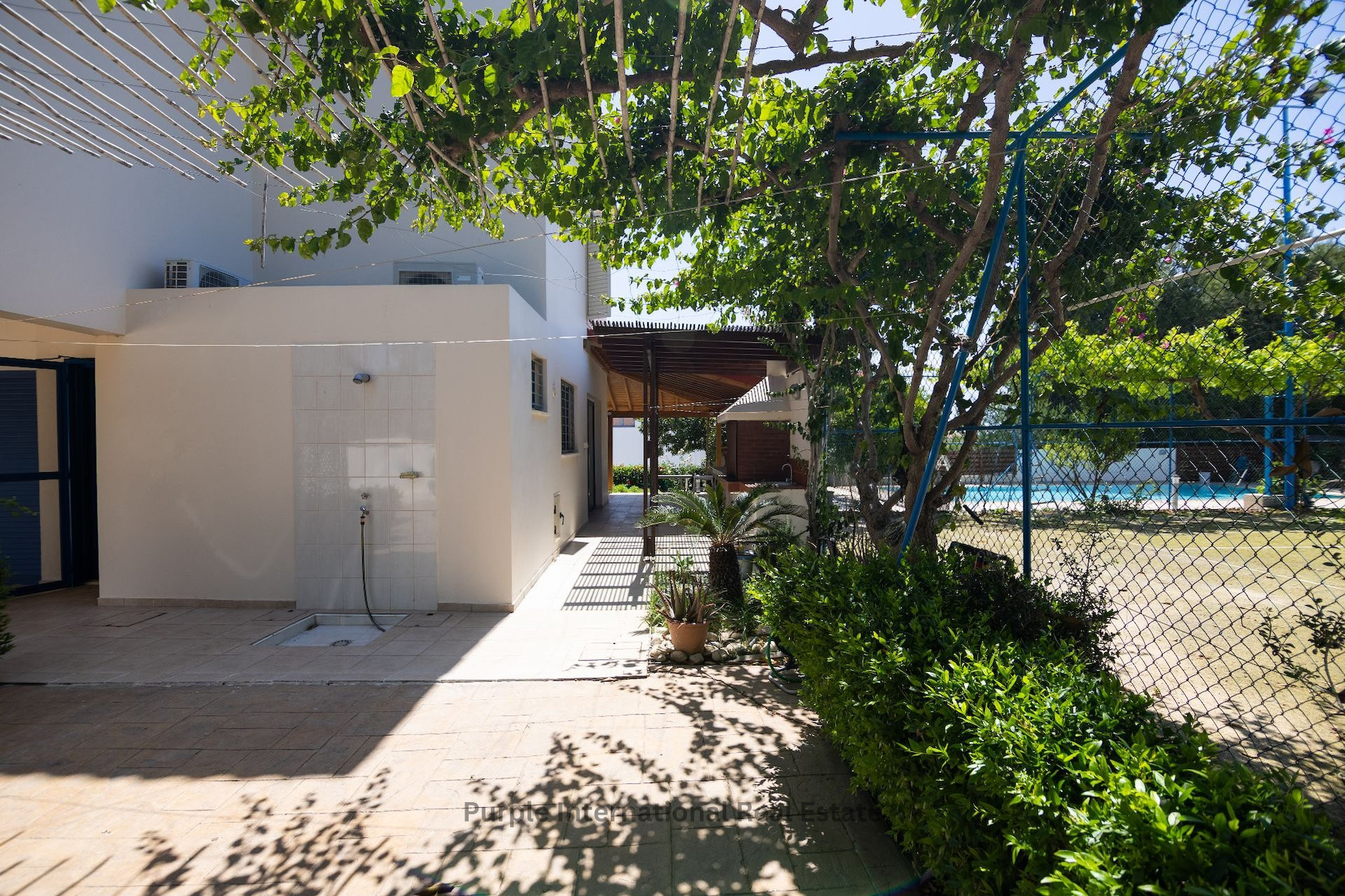 Designed for outdoor living, the villa boasts a large swimming pool, a private tennis court, a dedicated barbecue area, and lush landscaped gardens, making it ideal for enjoying the idyllic Cyprus climate year-round. The ground floor features a spacious living area, a separate kitchen and dining space, and a convenient guest bathroom with a shower. Step outside to a large veranda shaded by a charming pergola, perfect for al fresco dining and relaxed summer gatherings.