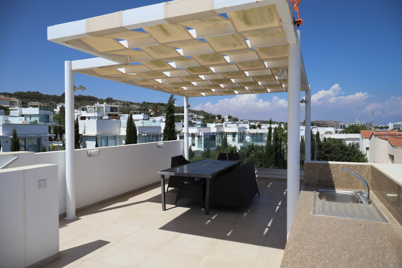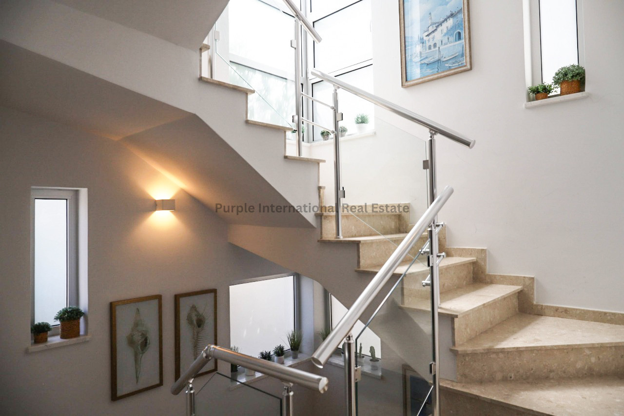 Outside, the villa is designed for effortless Mediterranean living, featuring a lush garden with mature fruit trees, a private swimming pool, a built-in BBQ area with counter space, and a covered pergola with parking for at least two cars. The impressive roof garden provides a cozy sitting area with panoramic views of the Mediterranean Sea — the perfect spot for sunset relaxation. Set within a secure, gated complex, the home offers both privacy and peace of mind, enhanced further by central gas heating for comfortable year-round living.
