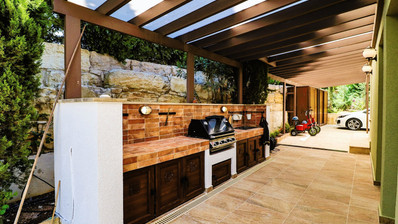 Stepping outside is quite breath taking, with very large entertainment areas for al fresco dining, a magnificent infinite edged swimming pool and lush mature landscaped garden. The villa also has a stunning BBQ area, lawn area and separate gazebo and has space for parking of several cars on the sweeping drive to the front.
