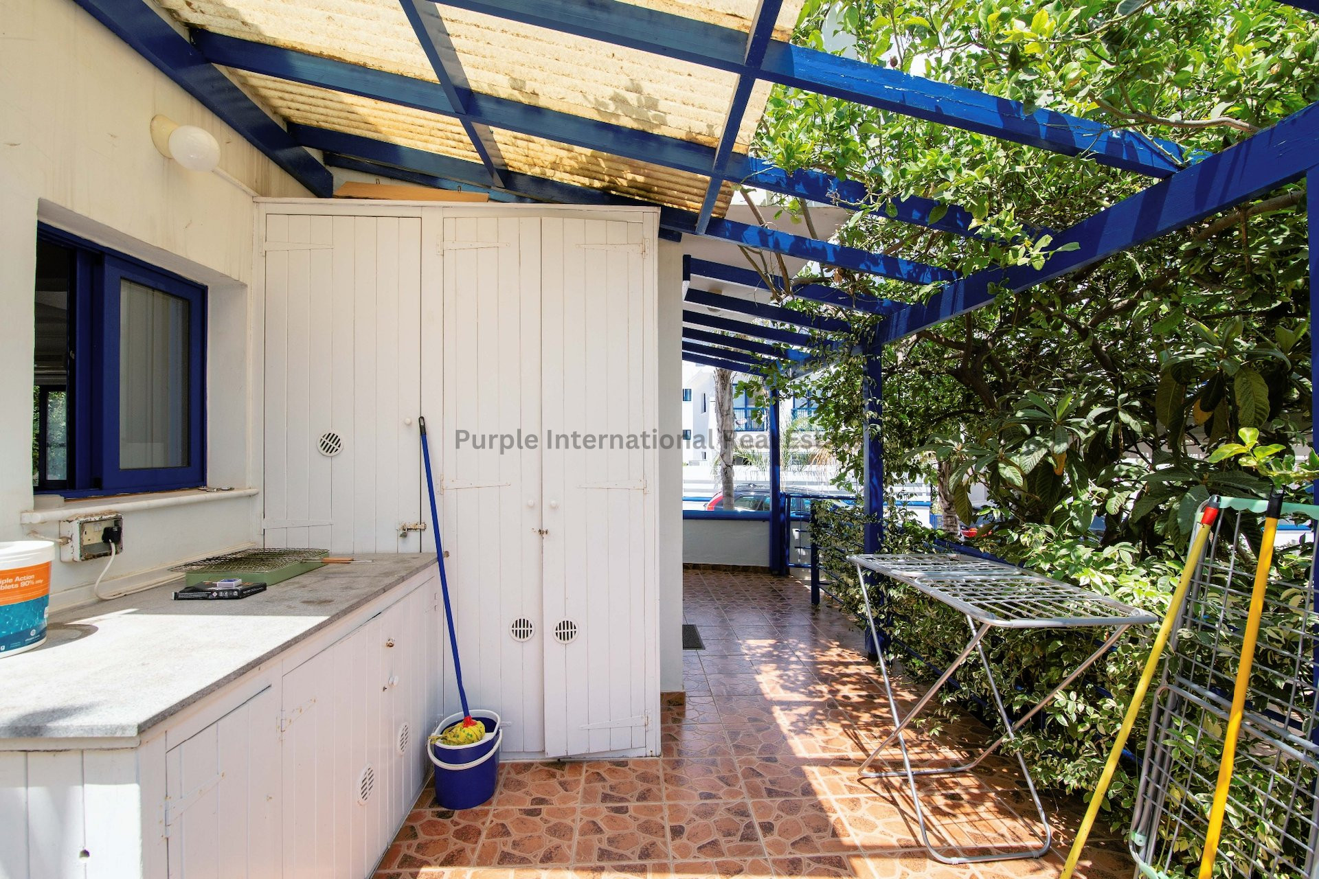 The outside garden area has a private swimming pool, storage room, barbeque area, outside open shower, a pergola covered seating area, mature plants and fruit trees.