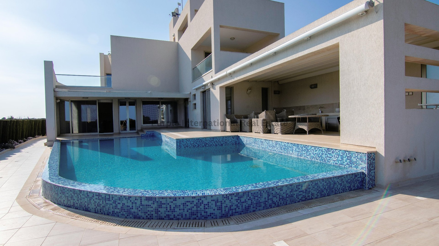 The villa sits on a substantial plot, featuring an enormous infinity overflow swimming pool and ample outdoor space for al fresco dining, sunbathing, and outdoor entertainment, perfect for unwinding and relaxation.
