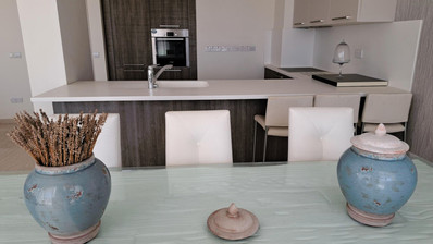Эти просторные апартаменты с 2 спальнями и 2 ванными комнатами предлагают 103 м² комфортного жилого пространства, идеально подходящего для тех, кто ищет спокойную жизнь у моря. Полностью меблированы качественной мебелью. Внутренняя планировка включает гостиную и столовую открытой планировки, современную кухню и две светлые спальни. В главной спальне есть отдельная ванная комната, а обе ванные комнаты элегантно оформлены с использованием современных сантехнических приборов.