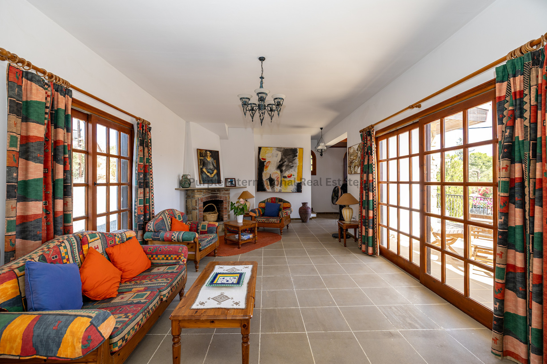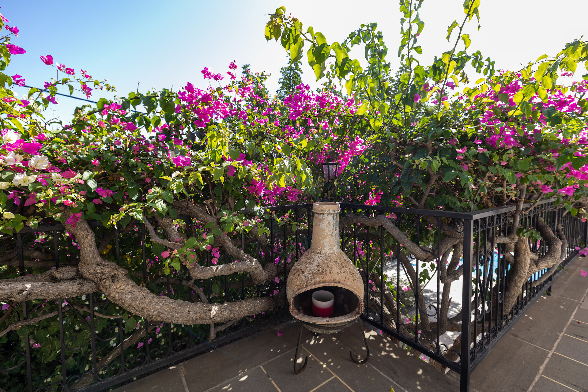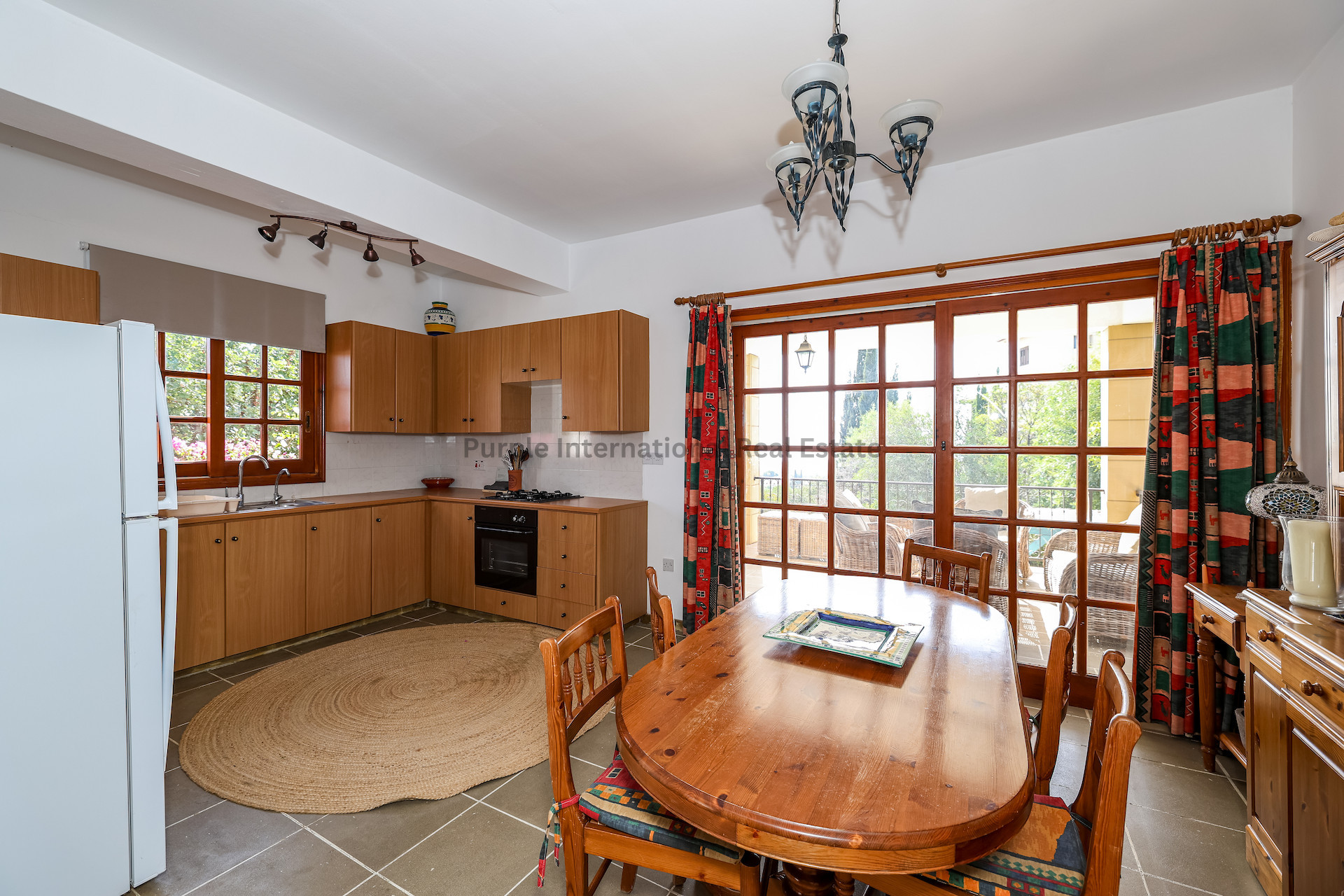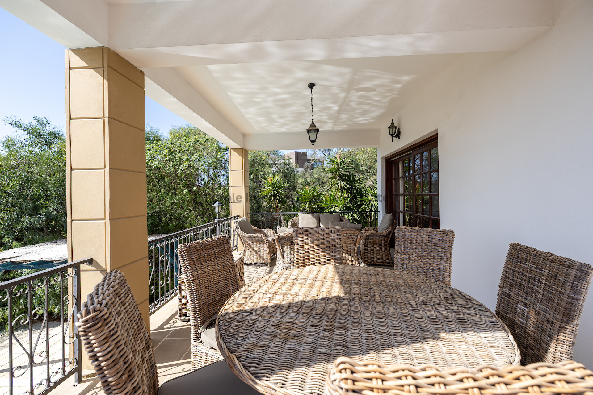 Из столовой большие раздвижные двери ведут на солнечную террасу с прекрасными видами на окрестности и далекие морские просторы. Эту открытую площадку можно использовать для обедов на свежем воздухе, утреннего кофе или вечерних встреч в спокойной обстановке.