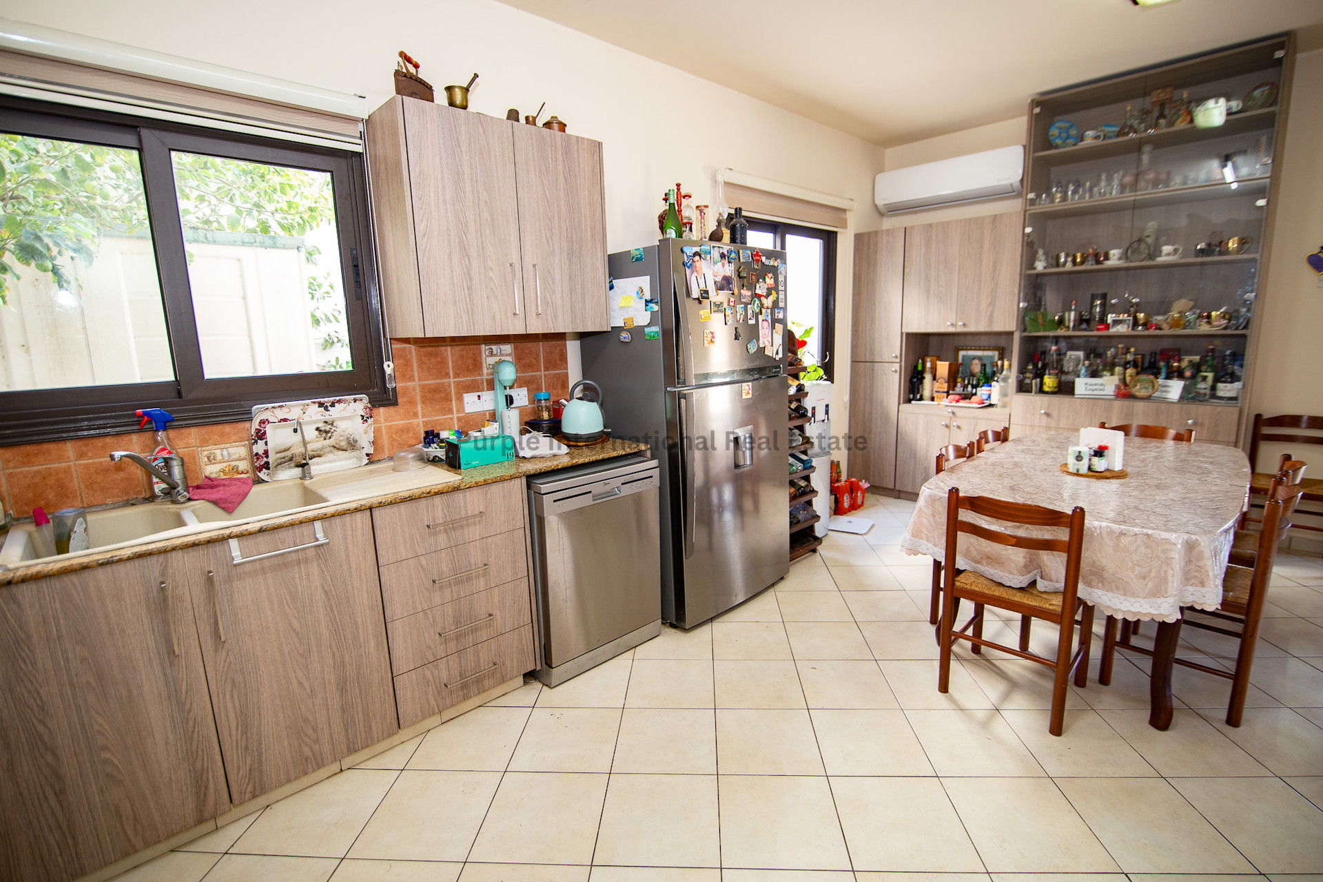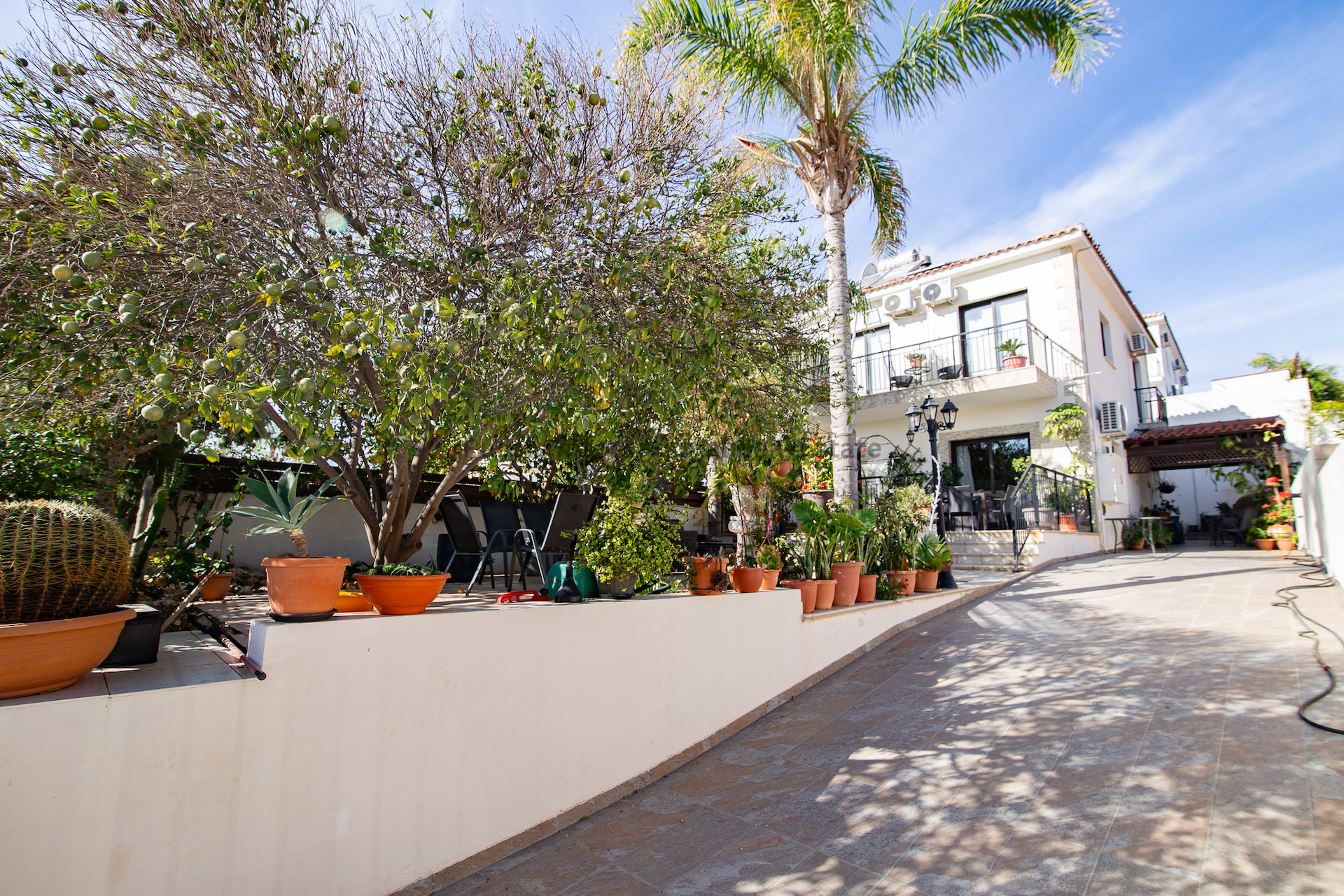 Снаружи дом расположен на просторном участке, окруженном зрелыми фруктовыми деревьями и яркими цветами, создавая спокойную атмосферу с тенистыми зонами для отдыха и обедов на свежем воздухе.